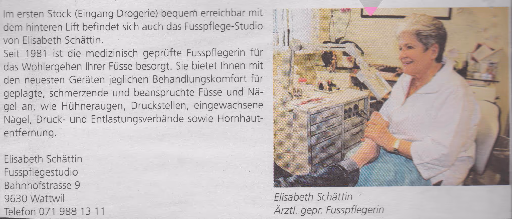 Im ersten Stock oberhalb der Drogerie und bequem mit dem Lift erreichbar, befand sich das Fusspflege-Studio von Elisabeth Schättin. Von 1982 bis 2018 war die medizinisch geprüfte Fusspflegerin für das Wohlergehen vieler Füsse besorgt.