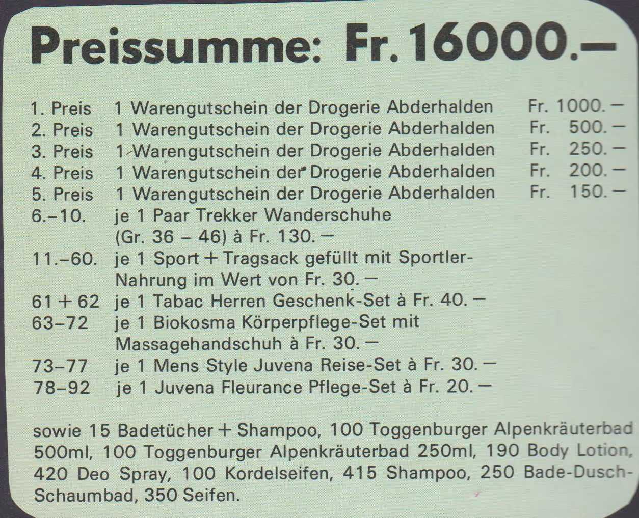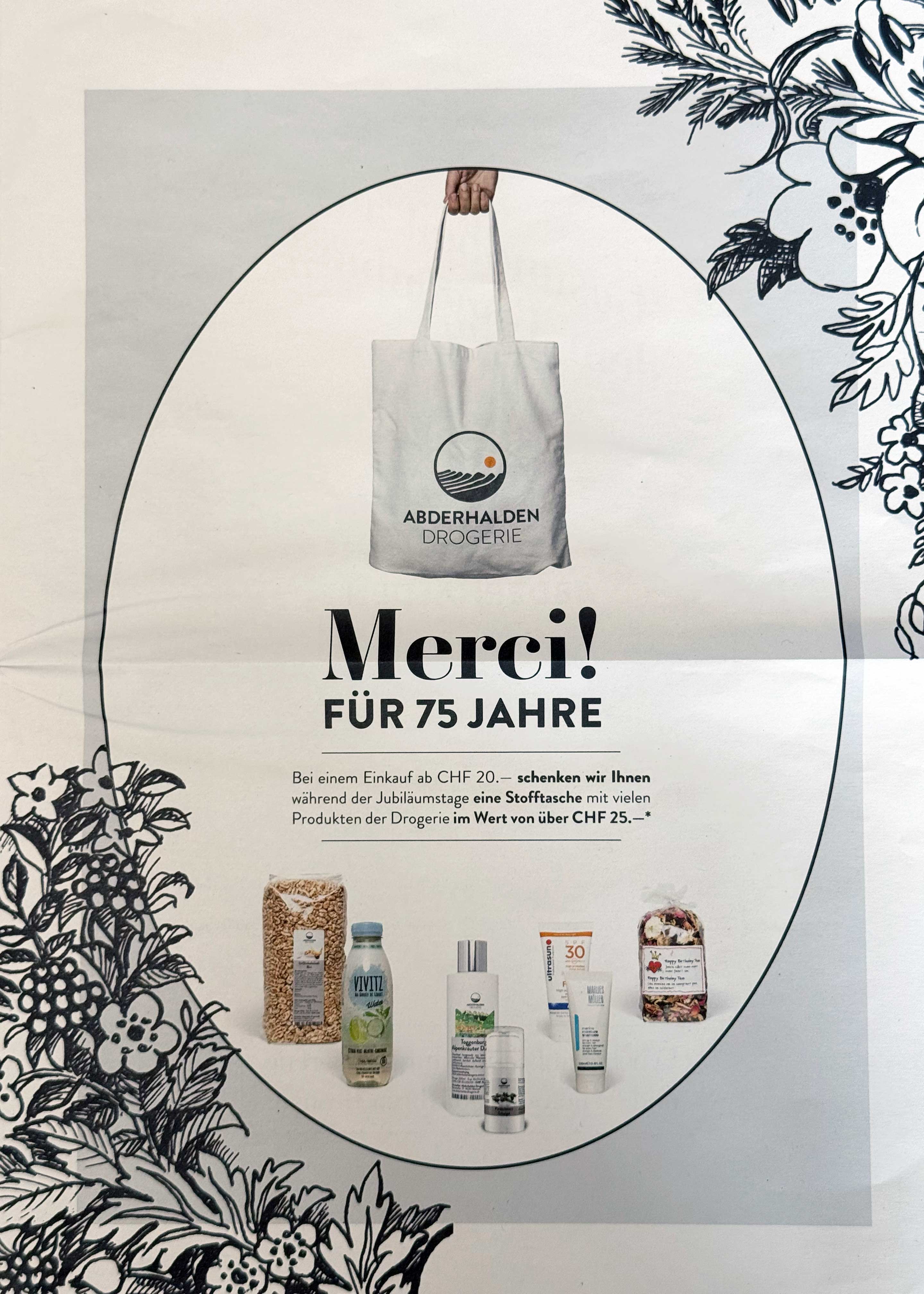 Im August 2020 durften wir das 75-jährige Bestehen der Abderhalden Drogerie AG feiern. Als Dank an unsere Kundschaft verschenkten wir eine Abderhalden -Tasche mit vielen Produkten. An 3 Tagen besuchten uns über 1000 Kunden und feierten mit uns. Mit einem Treffen der ehemaligen Mitarbeiter und einem Sonntagsbrunch liessen wir die Festlichkeiten ausklingen.